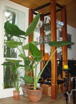 Die Taro-Pflanze, eine hawaiianische Kulturpflanze, die sich offenbar in unserem Wintergarten richtig wohlfühlt und vermehrt.